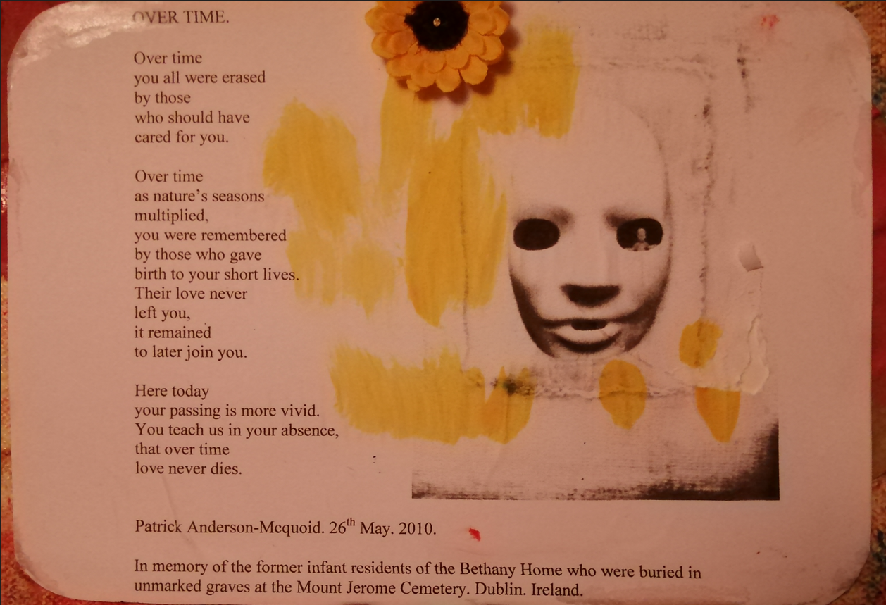 One-Person Exhibition, “Between Then and Now”, Art works included: Book Launch, Video, Poetry Reading, Jar Installation, Workhouse Installation. Official opening performed by Alf McCarthy (Broadcaster/Actor/Writer). Invited Guests: Charlie McGettigan (Singer/Songwriter), Martin O’Hara (Rap Poet), Dympna Molloy (Poet), Noel Molloy (Performance Artist), Devon MacFillivray (Music), Dermot McNabb (Talk), Teresa O’Callaghan (Talk), and Carrick Workhouse, in association with Carrick-on-Shannon Heritage Group – County Leitrim, Ireland.